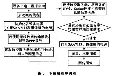 下位機(jī)軟件通過(guò)驅(qū)動(dòng)程序提供的接口,在遠(yuǎn)程圖像監(jiān)控設(shè)備中完成硬件的初始化、控制等功能,同時(shí)又負(fù)責(zé)圖像的壓縮和傳輸。它是所有設(shè)備的控制中樞,因此這里著重描述下位機(jī)軟件的工作流程,如圖5所示。