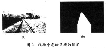 圖像二值化后的結(jié)果如圖2(a)所示,得到的最終結(jié)果如圖2(b)所示。從兩幅圖像的對(duì)比可以看出,圖像經(jīng)過(guò)一系列處理后,基本標(biāo)定了危險(xiǎn)區(qū)域。對(duì)于得到的圖2(b),圖中白色的區(qū)域?yàn)殍F道雙軌內(nèi)部即設(shè)定的危險(xiǎn)區(qū)域。應(yīng)用此種方法得到的結(jié)果圖像在光照條件充足情況下能夠得到更好的效果,不適用于光照條件不足和夜間的危險(xiǎn)區(qū)域標(biāo)定。