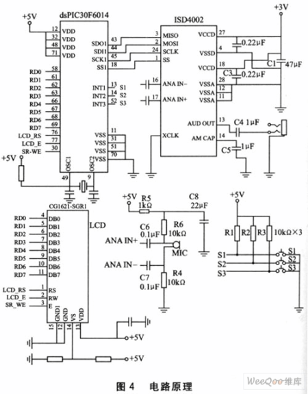 電路原理如圖4所示。整個(gè)電路由語(yǔ)音錄放電路、話筒輸入電路、按鍵開關(guān)電路及LCD顯示電路構(gòu)成。由于本設(shè)計(jì)輸出直接驅(qū)動(dòng)普通耳機(jī),經(jīng)實(shí)驗(yàn)不需外部功放電路,直接利用ISD4002內(nèi)部功放輸出即可。ISD4002作為從機(jī),其SPI接口的MOSI接控制器的SDO;MISO接控制器的SDI;SCLK接SCK;SS接控制器的SS即可。LCD用于人機(jī)交互的界面顯示。