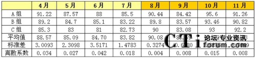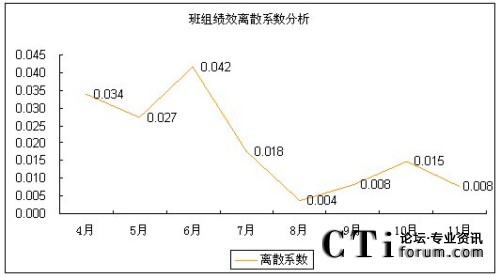 無(wú)論從標(biāo)準(zhǔn)差的走勢(shì)還是從離散系數(shù)的走勢(shì)上來(lái)看,8-11月各班組的績(jī)效得分差距明顯比4-7月的績(jī)效得分差距要小。從另一個(gè)角度來(lái)看,就是該呼叫中心各班組的績(jī)效水平更趨于均衡,呼叫中心人員的整體技能和服務(wù)水平的二極化差異開始縮小。
