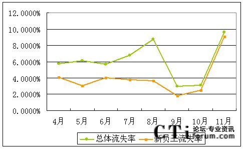 從該中心的運(yùn)營(yíng)數(shù)據(jù)來(lái)看,另一個(gè)發(fā)生明顯變化的就是實(shí)行團(tuán)隊(duì)激勵(lì)后新員工的流失率開始明顯增加。以下是我們提取4-11月該呼叫中心員工流失方面的數(shù)據(jù):