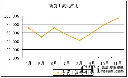 而對(duì)流失員工的結(jié)構(gòu)性分析我們發(fā)現(xiàn),4-11月期間新員工流失占總體流失人數(shù)的比例在不斷上升,4-8月基本在50%上下波動(dòng),而從9月份開始直線上升,到11月份更達(dá)到了占到流失總?cè)藬?shù)的94.12%。當(dāng)月有16名入職不到三個(gè)月的新員工離職,而老員工只有1人離職。