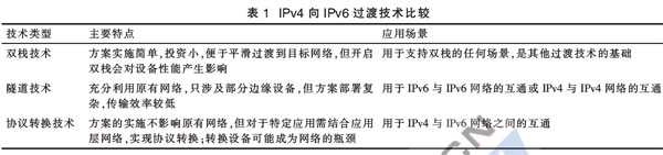 目前,主要的過渡技術(shù)有雙棧技術(shù)、隧道技術(shù)和協(xié)議轉(zhuǎn)換技術(shù)等。雙棧技術(shù)就是在設(shè)備上同時安裝IPv4和IPv6協(xié)議棧,應(yīng)用程序根據(jù)DNS解析地址類型選擇使用IPv6或IPv4;隧道技術(shù)有多種實現(xiàn)方式,主要將IPv6報文作為IPv4的凈荷,實現(xiàn)IPv6孤島之間的互聯(lián),或者以相反方式實現(xiàn)IPv4孤島之間的互聯(lián);協(xié)議轉(zhuǎn)換技術(shù)通常應(yīng)用在IPv6和IPv4網(wǎng)絡(luò)的交界處,實現(xiàn)IPv6主機與IPv4主機之間的互通。