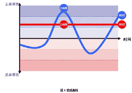 諾貝爾獎得主心理學(xué)家Daniel Kahneman發(fā)現(xiàn)人們在一次體驗中只會記住兩件事:峰值感受(流程中最好或最差的一點)以及終了感受。我運用“峰值——終了規(guī)則”將每個子流程上的情感感受按照自然時間順序連成一根“情感”曲線,如圖1所示。