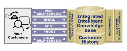 Technologies”是一家非常著名的多接觸點呼叫中心供應(yīng)商,這家公司建議采用“通用事故”追蹤機(jī)制,它強(qiáng)調(diào)報表和歷史紀(jì)錄必須作為任何一個多接觸點聯(lián)絡(luò)中心不可或缺的組成部分!癛ightnow”提供的以下插圖很清楚地向我們展示了多渠道知識庫集成是如何被強(qiáng)制執(zhí)行的。