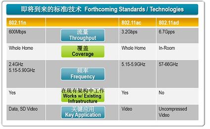 在802.11a/b/g/n等標(biāo)準(zhǔn)不斷刷新更高覆蓋率和數(shù)據(jù)傳輸率的同時,新的標(biāo)準(zhǔn)如802.11ac、802.11ad等都正在嶄露頭角。Michael介紹說,與802.11n 600Mbps的流量相比,ac和ad的流量將分別高達3.2Gbps和6.7Gbps,頻率范圍分別為5.15GHz~5.9GHz和57GHz~66GHz。從應(yīng)用角度看,ac會定位在整個家居多個室內(nèi)的多媒體內(nèi)容共享;而ad由于傳輸距離有限,用于單個居室內(nèi)未壓縮高清視頻的短距離傳輸,即可能會成為HDMI標(biāo)準(zhǔn)的替代者。