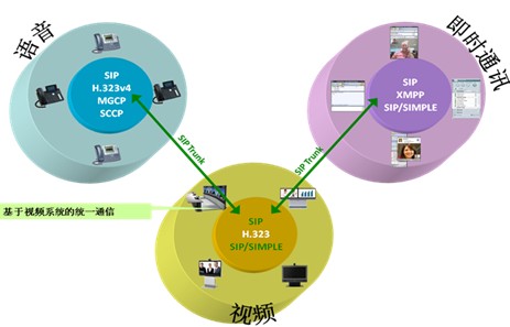 所有的視頻系統(tǒng)采用H.323/SIP方式獨立存在,網(wǎng)絡(luò)層采用SIP協(xié)議和即時通訊、語音等進(jìn)行連接,這樣就可以克服視頻終端遷移帶來的種種弊端。這樣做的前提條件,是要在視頻系統(tǒng)里部署一個視頻通訊服務(wù)器,完成H.323/SIP的轉(zhuǎn)換,完成基于H.323/SIP的雙流和呼叫控制,而不是一個傳統(tǒng)的H.323的網(wǎng)守可以完成的功能。一個完整的基于視頻的統(tǒng)一通信系統(tǒng),只有采用這種方式,才可以實現(xiàn)真正的視頻系統(tǒng)、即時通信系統(tǒng)、語音系統(tǒng)的統(tǒng)一通信。