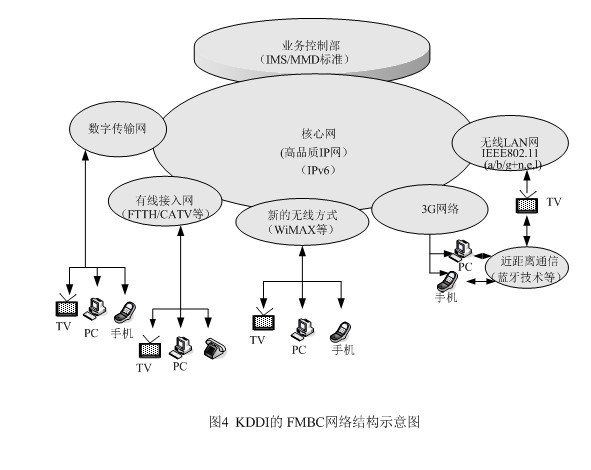 為了在市場競爭中立于不敗之地,KDDI另辟稀徑,提出了將固定網(wǎng)、移動網(wǎng)、因特網(wǎng)和電視廣播相融合的概念,它與朝日新聞、朝日電視簽署合作框架,就是它的集中代表。FMBC是超3G的構(gòu)想,是以移動通信為基礎(chǔ),與固定電話網(wǎng)及因特網(wǎng)進行融合,現(xiàn)在又把廣播電視納入,這樣它就成了KDDI的NGN了。FMBC的網(wǎng)絡(luò)結(jié)構(gòu)請見圖4。從圖4上不難發(fā)現(xiàn)NGN的影子,特別是業(yè)務(wù)控制部的設(shè)立,并采用ISM/MMD標(biāo)準(zhǔn),將網(wǎng)絡(luò)與應(yīng)用分開,以利新業(yè)務(wù)的開拓,同時完成核心網(wǎng)的IP化,這些都是NGN的基本概念。