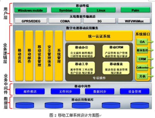 移動工單系統(tǒng)是在Windows Mobile智能手機操作系統(tǒng)上自主研發(fā),采用B/S和C/S混合架構(gòu),以TCP/IP作為基礎(chǔ)數(shù)據(jù)傳輸協(xié)議,通過移動通信網(wǎng)絡(luò)無線數(shù)據(jù)通道GPRS/EDGE/CDMA1x等,將呼叫中心的工單數(shù)據(jù)推送到智能手機上,由外勤服務(wù)人員將服務(wù)情況進行實時的反饋。利用的同步中間件可將最新的資訊文件推送到手機終端上,服務(wù)人員無需登錄即可在終端可以查看最新的廣電資訊,可支持doc、xls、ppt等 Office文檔格式的瀏覽,支持WMV、WAV、3GP多種音視頻文件播放。服務(wù)人員可以不受地點和時間的限制通過終端實時獲取最新的多媒體客戶交互中心運營數(shù)據(jù)報表,圖2為系統(tǒng)設(shè)計方案圖。