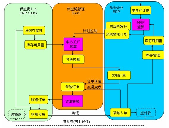在線需求計劃管理。當龍頭完成企業(yè)內(nèi)部的MRP運算后,便輸出“采購需求計劃”;該計劃作為供應(yīng)鏈管理平臺,中心工廠(或稱虛擬企業(yè))運算的輸入,此刻供應(yīng)鏈管理平臺可以動態(tài)地挖掘供應(yīng)商的(ERP)的“庫存可用量”,并計算出“可供應(yīng)量”,該數(shù)據(jù)可提供給龍頭企業(yè)編制“采購訂單”。