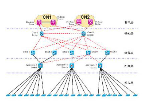 現(xiàn)在中國是世界上最大互聯(lián)網(wǎng)國家,我們國家有著最大的互聯(lián)網(wǎng)使用群體。據(jù)中國互聯(lián)網(wǎng)絡(luò)信息中心(CNNIC)發(fā)布的《第25次中國互聯(lián)網(wǎng)絡(luò)發(fā)展狀況統(tǒng)計報告》數(shù)據(jù)顯示,截至2009年12月,我國網(wǎng)民規(guī)模已達3.84億,互聯(lián)網(wǎng)普及率進一步提升,達到28.9%。據(jù)預測,到2010年底,網(wǎng)民數(shù)量將超過5億。三大運營商在今年的寬帶用戶數(shù)數(shù)量近2億(1)。如此龐大的用戶規(guī)模群體對運營商網(wǎng)絡(luò)是一個嚴峻的考驗,F(xiàn)在的運營商網(wǎng)絡(luò),仍然是接入層,匯聚層和核心層三層架構(gòu)為主體,總的帶寬近40T。以中國電信集團為例,運營商的現(xiàn)有IP骨干網(wǎng)絡(luò)架構(gòu)一般如下圖所示: