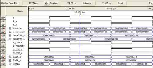 使用的信號包括:數(shù)據(jù)信號data_a,dat_b;讀寫有效信號wren_a,wren_b;地址信號address_a,address_b;時鐘信號clock_a,clock_b;輸出數(shù)據(jù)信號q_a,q_b?梢钥吹剿械男盘柖际浅蓪Τ霈F(xiàn)的,就是為了進行乒乓方式的數(shù)據(jù)傳輸。分成了兩個RAM區(qū)域,A和B,相當于前面講乒乓方式里的數(shù)據(jù)緩沖模塊1和2。兩個RAM塊是交替著讀寫(由I_a和I_b決定),輸出數(shù)據(jù)流也是由I決定。剛說到寫時鐘是13.5M,讀時鐘是27M,所以clock_a和clock_b必須是讀寫時鐘切換著輸入,而且地址的計數(shù)也不一樣,寫周期時候地址增加的時鐘是13.5M,讀周期地址增加的時鐘是27M。所以每行的數(shù)據(jù)讀了兩遍,相當于隔行變逐行。圖6在Qartus II下RAM的乒乓操作功能仿真圖: