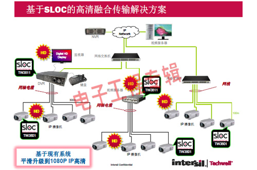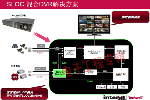 革命性的Intersil Techwell SLOCTM(Security Link over Coax)同軸電纜復(fù)合視頻傳輸解決方案是可通過(guò)一條同軸電纜同時(shí)傳輸模擬 CVBS 視頻和高清數(shù)字 IP 視頻信號(hào)的先進(jìn)調(diào)制解調(diào)器解決方案,其采用最新MODEM PHY技術(shù)的傳輸解決方案,可以基于同軸電纜同時(shí)傳輸高清IP碼流和標(biāo)清模擬實(shí)時(shí)視頻。