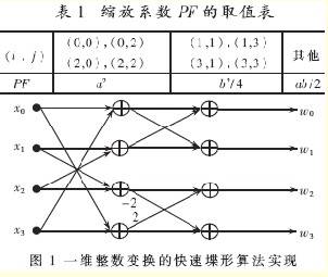 (1)在求取變換陣W=CXCT時(shí),根據(jù)變換的對(duì)稱性,將X的列變換(矩陣左乘)與行變換(矩陣右乘)分開(kāi)實(shí)現(xiàn),把二維變換分割為兩次一維變換,并采用快速堞形算法[4]來(lái)實(shí)現(xiàn)。一維變換的快速算法實(shí)現(xiàn)如圖1所示,其中的列變換可用如下算式表示: