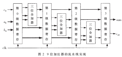 (2)針對(duì)不同運(yùn)算的位寬需要,設(shè)計(jì)專用的加法器和乘法器。本文對(duì)整數(shù)變換中的加法器采用三級(jí)流水線加法器,實(shí)現(xiàn)9位加法,每級(jí)流水線完成三位超前進(jìn)位加法,將邏輯延遲限制在三位加法器之內(nèi)。圖2給出了9位加法器的流水線實(shí)現(xiàn)框圖。選用EPF10K10LC84-3作為適配器件,經(jīng)過(guò)Synplify Pro 7.3綜合,結(jié)果表明這種加法器具有較優(yōu)的最高工作頻率和硬件開(kāi)銷。如表2所示, 常規(guī)加法器的最高工作頻率為37.0MHz,消耗資源卻為28LC,而經(jīng)過(guò)優(yōu)化的三級(jí)流水線加法器在消耗資源增加不多的情況下,其最高工作頻率相比常規(guī)加法器提高了257%,達(dá)到94.5MHz。