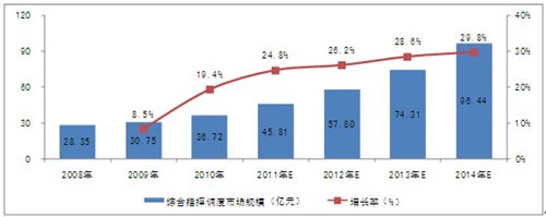 根據(jù)對下游行業(yè)的調(diào)研和關(guān)聯(lián)市場的分析,2010年,中國指揮調(diào)度市場規(guī)模已達到28.1億元。隨著下游行業(yè)投資規(guī)模的擴大、產(chǎn)品的升級換代及技術(shù)的發(fā)展,行業(yè)市場規(guī)模將保持較快的增長速度,未來4年的復(fù)合增長率為26.31%,2014年,市場規(guī)模將達到69.8億元。