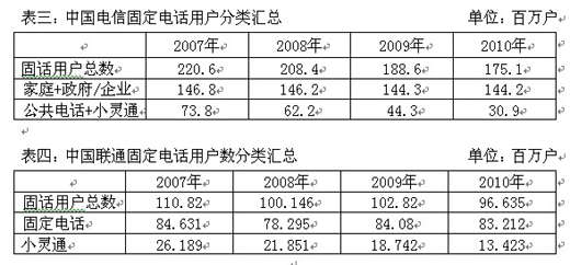 從表中可以看出,中國電信每年的固定電話用戶總數(shù)持續(xù)下降,下降速度最快的是小靈通業(yè)務(wù),剔除小靈通和公共電話業(yè)務(wù),中國電信的固定電話用戶量實(shí)際上一直穩(wěn)定在1.4億戶以上,中國聯(lián)通公司的固定電話用戶量則一直穩(wěn)定在8000萬戶以上。
