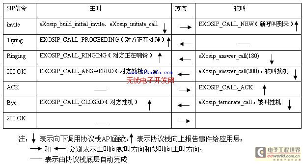 oSIP/eXosip對消息的報告有2種工作模式:事件模式和回調(diào)模式。本設(shè)計采用事件模式, 通過函數(shù)eXosip_event_wait定時輪詢獲取SIP事件。SIP信令的實現(xiàn)如表2