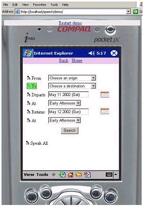 .NET Speech SDK目前為免費(fèi)提供。其中包括設(shè)置Web應(yīng)用的語音輸入/輸出動作的工具、用于根據(jù)不同的應(yīng)用來限制終端用戶語言的語音語法編輯器、語音即時(shí)編輯器、語音調(diào)試工具以及嵌入到WWW瀏覽器(面向個(gè)人電腦的IE)中的試驗(yàn)用插件等。微軟今后還將繼續(xù)強(qiáng)化其功能,在2003年公布正式版以前,準(zhǔn)備追加使用電話的語音識別功能、支持用于PDA的“Pocket Internet Explorer”的語音識別插件,以及在終端和服務(wù)器上負(fù)責(zé)語音處理的分散型語音識別功能等。上圖顯示了具有語音識別功能的面向Pocket PC的應(yīng)用的演示畫面。單擊左測的麥克風(fēng)形狀的圖標(biāo)后,就可以利用語音操作菜單。另外,.NET Speech SDK 1.0版只有英文版,供貨時(shí)間尚未確定的2.0版據(jù)稱將支持日語和其他語言。