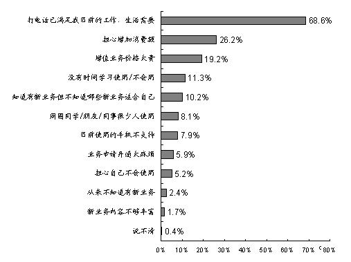 調(diào)查發(fā)現(xiàn),目前制約手機(jī)用戶使用更多數(shù)據(jù)增值業(yè)務(wù)的原因主要是:“打電話已經(jīng)滿足目前的工作/生活需要”(占68.6%)、“擔(dān)心增加消費(fèi)額”(占26.2%)、“增值業(yè)務(wù)價(jià)格太貴” (占19.2%)、“沒(méi)有時(shí)間學(xué)習(xí)使用/不會(huì)用”(占11.3%)、“知道有新業(yè)務(wù)但不知道哪些新業(yè)務(wù)適合自己”(占10.2%)等。