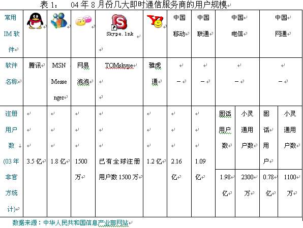 11月16日,TOM在線和歐洲行業(yè)巨頭Skype在京聯手推出聊天工具TOM-Skype,此業(yè)務的出現,立即在即時通信市場上掀起了軒然大波。其清晰的話音質量,簡潔方便的操作界面,擁有來自165個國家1500多萬的全球用戶,在極短的時間內就吸引到了大量的中國用戶,更讓基礎運營商感到不安的是skype強大的語音聊天功能將可能大大改變傳統(tǒng)電信的使用習慣;而與此同時,現有的QQ,POPO等國內即時通信工具也早已開展了語音聊天功能,只是苦于目前話音質量不盡理想而已。面對眾多虛擬運營商現實和潛在威脅,幾大基礎運營商選擇先下手為強,進入“即時通信”市場的戰(zhàn)略也就不足為怪了。