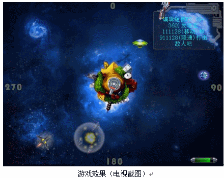 用戶根據(jù)游戲規(guī)則通過(guò)固定電話、小靈通和手機(jī)參與《地球保衛(wèi)戰(zhàn)》游戲,就能在短信、語(yǔ)音和電視畫(huà)面提示下完成游戲,觀眾通過(guò)電視就可以看到火爆的游戲畫(huà)面,仿佛如身臨其境;又可以通過(guò)參與游戲獲得積分,贏取大獎(jiǎng)。