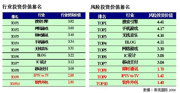 搜索引擎行業(yè)投資潛力最大,無論是行業(yè)投資價值還是風險投資價值均名列第一。網(wǎng)絡(luò)游戲行業(yè)兩方面投資潛力均具備,但由于行業(yè)面臨整合,致使風險投資價值略遜。隨著
