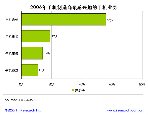 iResearch艾瑞市場(chǎng)咨詢根據(jù)IDC統(tǒng)計(jì)數(shù)據(jù)顯示,2006年手機(jī)制造商最感興趣的手機(jī)業(yè)務(wù)情況,手機(jī)音樂(lè)是手機(jī)制造商最感興趣的業(yè)務(wù),提及率達(dá)到56%,然后依次是手機(jī)電視19%、手機(jī)郵箱14%以及手機(jī)游戲11%.