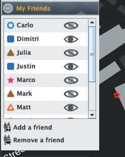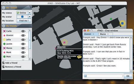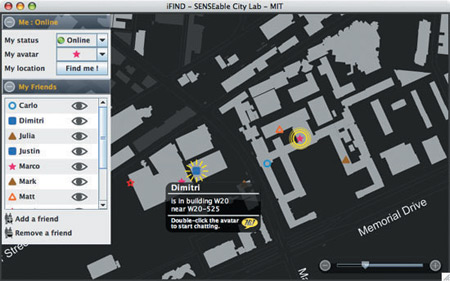 該軟件名為iFind,乍一看類似任何典型的即時通信軟件,也需要雙方相互邀請,這樣才能進(jìn)入對方的好友名單。用戶可以選擇暫時隱藏起來,不讓某個好友或者整個群組看見自己,他們還可以完全把某人從好友名單中刪除。不過iFind的好友名單增加了地圖,可以實(shí)時顯示這些朋友在MIT校園的哪個角落。地圖顯示了通過Wi-Fi登錄到MIT網(wǎng)絡(luò)上的好友,讓用戶可以為每個朋友創(chuàng)建獨(dú)特的迷你頭像,能看到誰在學(xué)校河邊閑逛、誰在樓上圖書館看書。