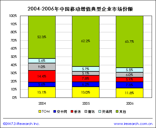 iResearch艾瑞市場(chǎng)咨詢(xún)最新的研究成果顯示,2004-2006年,在中國(guó)的移動(dòng)增值市場(chǎng)中,TOM、新浪的市場(chǎng)份額處于不斷下降的趨勢(shì),其中下降最明顯的是新浪網(wǎng),它的市場(chǎng)份額已由2004年的14.4%下降到2006年的5.9%,但與此同時(shí)空中網(wǎng)的市場(chǎng)份額卻處于增長(zhǎng)趨勢(shì),已由2004年的5.6%增長(zhǎng)到2006年的7.3%.