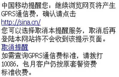從2007年5月17日起,通過手機(jī)訪問WAP網(wǎng)站,中國(guó)移動(dòng)向用戶主動(dòng)提供一個(gè)收費(fèi)提示頁(yè)面,提醒用戶“正在使用手機(jī)上網(wǎng)業(yè)務(wù),若繼續(xù)瀏覽網(wǎng)頁(yè),將會(huì)產(chǎn)生GPRS通信費(fèi)”。但打開中國(guó)移動(dòng)夢(mèng)網(wǎng)頁(yè)面,則不會(huì)有上述提示。