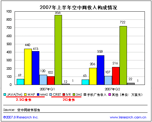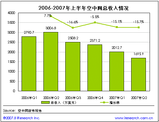空中網2007年第二季度財報數據顯示,第二季度空中網的總收入1695.9萬美元,同比負增長43.6%,環(huán)比負增長15.7%。與第一季度相比在空中網兩個產品平臺的主要2G業(yè)務和2.5G的業(yè)務收入都出現了不同程度的下降,但2G業(yè)務中的IVR業(yè)務收入則出現了大幅上升。