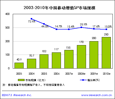 中國(guó)移動(dòng)增值服務(wù)從其產(chǎn)生開(kāi)始,便因其服務(wù)的多樣性和個(gè)性化而受到廣大用戶的歡迎,市場(chǎng)規(guī)模增長(zhǎng)非常迅速。大眾移動(dòng)增值業(yè)務(wù)市場(chǎng)是一塊增長(zhǎng)快速、極具吸引力的沃土,以短信為代表的移動(dòng)增值業(yè)務(wù)正在為移動(dòng)運(yùn)營(yíng)商和服務(wù)、服務(wù)提供商(SP)創(chuàng)造更多的收入,而WAP/MMS/Java等2.5G業(yè)務(wù)也將從2007年開(kāi)始進(jìn)入高速發(fā)展階段。