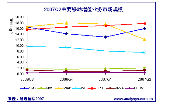 易觀國際研究表明,2007年第2季度移動(dòng)增值服務(wù)整體市場規(guī)模為57.42億元,同比下降2.33%。其中彩鈴業(yè)務(wù)收入居首位達(dá)17.75億元。