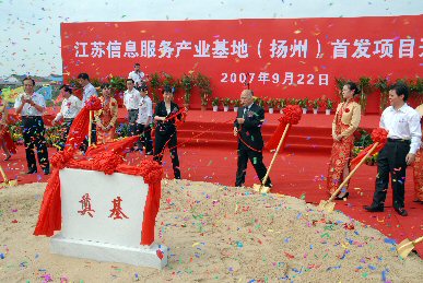 日前,江蘇信息服務(wù)產(chǎn)業(yè)基地(揚(yáng)州)首發(fā)項(xiàng)目開工典禮在廣陵新城隆重舉行,這標(biāo)志著產(chǎn)業(yè)基地建設(shè)邁入了實(shí)質(zhì)性階段。揚(yáng)州市人民政府市長(zhǎng)王燕文和天津泰達(dá)公司董事長(zhǎng)劉惠文為奠基石揭幕,市委常委、常務(wù)副市長(zhǎng)王榮平致賀詞,江蘇省信息產(chǎn)業(yè)廳副廳長(zhǎng)龔懷進(jìn)出席了開工典禮。