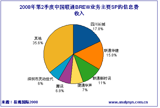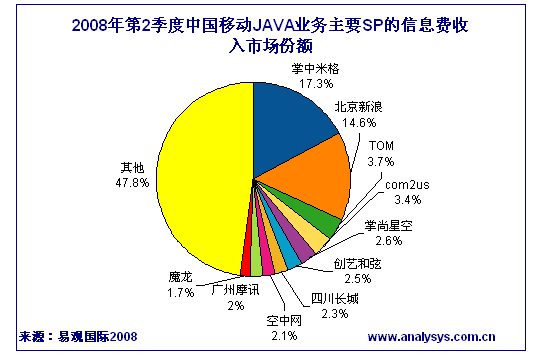 易觀國際近期發(fā)布《2008年第2季度中國手機(jī)游戲市場(chǎng)季度監(jiān)測(cè)》顯示:中國移動(dòng)JAVA業(yè)務(wù)SP信息費(fèi)方面,掌中米格、北京新浪分居前兩名,兩者市場(chǎng)占有率已提高至31.9%。其中掌中米格信息費(fèi)季度收入達(dá)到2505.86萬元,市場(chǎng)占比為17.3%,而新浪信息費(fèi)收入市場(chǎng)占比為14.6%。信息費(fèi)收入的第3至第5名依次為TOM、com2us、掌尚星空,三者總市場(chǎng)占比為9.7%。