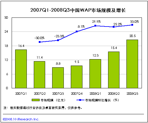 艾瑞咨詢研究發(fā)現(xiàn),2008年第三季度,WAP總體市場規(guī)模為20.5億,環(huán)比增長33.0%.其中,中國移動官方WAP市場規(guī)模為18.6億,環(huán)比增長27.1%,中國聯(lián)通官方WAP市場規(guī)模為1.88億,環(huán)比增長24.8%。
