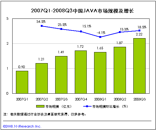 艾瑞咨詢研究發(fā)現(xiàn),2008年第三季度JAVA市場規(guī)模為2.22億,同比增長48.2%.在奧運(yùn)影響移動增值市場規(guī)模整體升溫的環(huán)境下,中國移動自9月1日進(jìn)一步屏蔽超過數(shù)量限制的單機(jī)游戲。