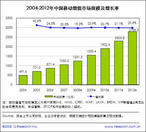 根據(jù)iResearch艾瑞咨詢即將推出的《2008-2009年中國移動互聯(lián)網(wǎng)行業(yè)發(fā)展報(bào)告》統(tǒng)計(jì),2008年中國移動增值市場規(guī)模達(dá)1251.3億人民幣(約合183.2億美元),相比2007年的1050億人民幣年同比僅增長19.2%,相比2007年增速放緩。(中國移動增值市場規(guī)模定義為用戶為各項(xiàng)移動增值業(yè)務(wù)付費(fèi)總和)