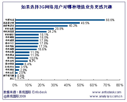 據(jù)易觀Enfodesk《中國3G市場用戶調(diào)研報告2009》研究發(fā)現(xiàn),可視電話成為最受用戶歡迎的增值業(yè)務(wù),除此之外,高速移動寬帶業(yè)務(wù)和高清晰語音受用戶選擇比例也較高,分別達到49.5%和40.2%。與此相反的是,手機社區(qū)、手機博客和殺毒/安全業(yè)務(wù)受歡迎程度最小。