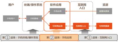 在楊俊看來(lái),應(yīng)用商店的到來(lái)改變了傳統(tǒng)模式。例如,開(kāi)放的互聯(lián)網(wǎng)模式推倒了原來(lái)的花園圍墻,手機(jī)軟件類型從單機(jī)應(yīng)用走向在線應(yīng)用,手機(jī)軟件來(lái)源從內(nèi)置型轉(zhuǎn)向用戶自主下載、自定制和自安裝。最重要的是,各大廠商不僅滿足于應(yīng)用商店這一畝三分地,而是把觸角延伸到了產(chǎn)業(yè)鏈上的各個(gè)環(huán)節(jié),由此形成了三個(gè)主要戰(zhàn)場(chǎng):手機(jī)終端及操作系統(tǒng)、手機(jī)應(yīng)用、互聯(lián)網(wǎng)入口,具體見(jiàn)圖所示。