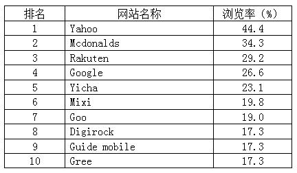 VRI的數(shù)據(jù)顯示,在手機(jī)網(wǎng)站瀏覽率TOP10的排名中,雅虎以44.4%的瀏覽率位居第一,google搜索以26.6%的瀏覽率位居第四,易查搜索以23.1%的瀏覽率緊隨其后,位居第五。雅虎作為綜合性門(mén)戶(hù)網(wǎng)站,不僅包括雅虎搜索,還包括雅虎電子商務(wù)。而麥當(dāng)勞手機(jī)網(wǎng)站以34.3%瀏覽率位居第二,用戶(hù)主要用于下載電子優(yōu)惠券。第三名是日本最大的電子商務(wù)網(wǎng)站樂(lè)天市場(chǎng),其瀏覽率為29.2%。