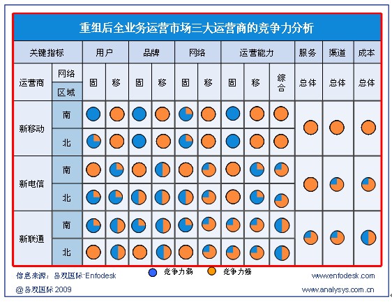 盡管產(chǎn)業(yè)鏈完備程度相差較為明顯,但運(yùn)營商各自業(yè)務(wù)與用戶服務(wù)運(yùn)營能力對(duì)3G時(shí)常的發(fā)展影響也至關(guān)重要,根據(jù)易觀國際Enfodesk發(fā)布的《國內(nèi)運(yùn)營商3G業(yè)務(wù)發(fā)展策略研究系列—中國3G市場現(xiàn)狀與發(fā)展策略概述》報(bào)告顯示,在發(fā)展3G的過程中,三大運(yùn)營商各自有一定的優(yōu)劣勢: