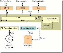 EWF能夠使操作系統(tǒng)可以從只讀媒體(如 CD ROM、寫保護硬盤或閃存)中啟動。所有對受到 EWF保護的卷進行的寫入都被重定向到覆蓋。這些寫入被緩存在覆蓋中并且作為卷的一部分提供。這會產(chǎn)生該卷可寫的表象。覆蓋可能存在于磁盤或隨機訪問內(nèi)存 (RAM) 中。如果需要,可以將覆蓋中存儲的數(shù)據(jù)提交給受保護的卷。