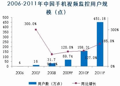 諾達(dá)咨詢預(yù)測,2006年中國手機(jī)監(jiān)控用戶以4萬點計算,2009年隨著運(yùn)營商3G網(wǎng)絡(luò)建設(shè)和3G業(yè)務(wù)的推進(jìn),用戶數(shù)將有大幅度增長,2010年用戶將達(dá)到158.31萬點,2011年達(dá)到451.18萬點。