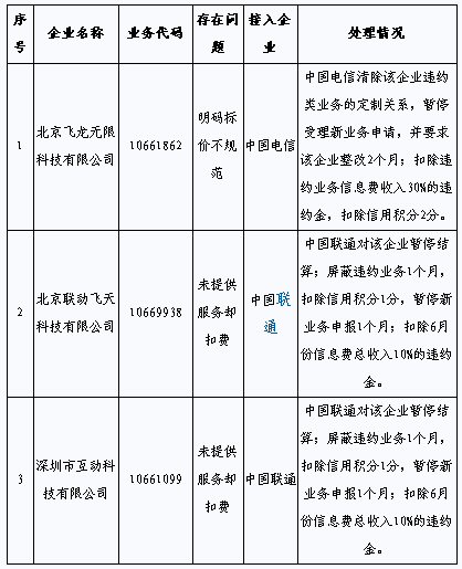 據悉,這3家增值電信企業(yè)是北京飛龍無限科技有限公司,存在明碼標價不規(guī)范問題;北京聯動飛天科技有限公司,未提供服務卻扣費;深圳市互動科技有限公司,未提供服務卻扣費。