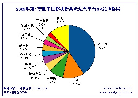 目前與新游戲平臺(tái)合作的SP包括空中網(wǎng)、騰訊、掌上明珠、TOM等在內(nèi)的共30家左右,在線游戲數(shù)量達(dá)80多款,從SP在新平臺(tái)的市場(chǎng)表現(xiàn)來看(具體見下圖):空中網(wǎng)占據(jù)中國(guó)移動(dòng)新平臺(tái)信息費(fèi)收入40.5%的份額,這促使空中網(wǎng)在手機(jī)游戲市場(chǎng)占據(jù)第一名的位置,目前空中網(wǎng)在新游戲平臺(tái)投放的手機(jī)游戲主要有周星星功夫臺(tái)球、異三國(guó)Online、天劫Online、功夫(周星馳大片)等,其中手機(jī)網(wǎng)游“天劫Online”的用戶歡迎度尤其突出。手機(jī)網(wǎng)游產(chǎn)品中深藍(lán)創(chuàng)娛的“深藍(lán)棋牌樂園之斗地主”、掌上明珠的“幻想i時(shí)代”、廣州盈正的“文明OL”等均有不錯(cuò)表現(xiàn)。因此用戶對(duì)手機(jī)網(wǎng)游產(chǎn)品的高關(guān)注度也肯定了了新游戲平臺(tái)推出的必要性。