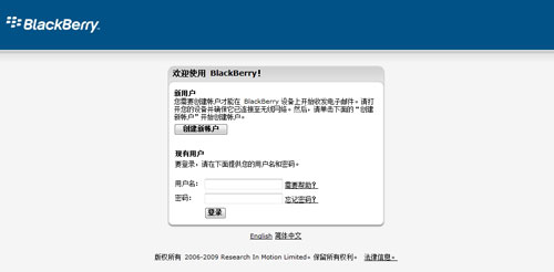 RIM為中國(guó)電信提供的黑莓BIS服務(wù)頁(yè)面