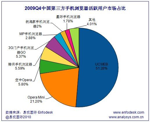 易觀國際(Analysys International)分析認(rèn)為,2009年4季度中國手機瀏覽器市場隨著騰訊、3G門戶等實力強勁的廠商發(fā)力,搶占用戶的市場競爭變得日漸激烈。處于不同手機瀏覽器陣營的廠商都紛紛通過技術(shù)改進與大力度的市場營銷廣泛推廣自有產(chǎn)品。