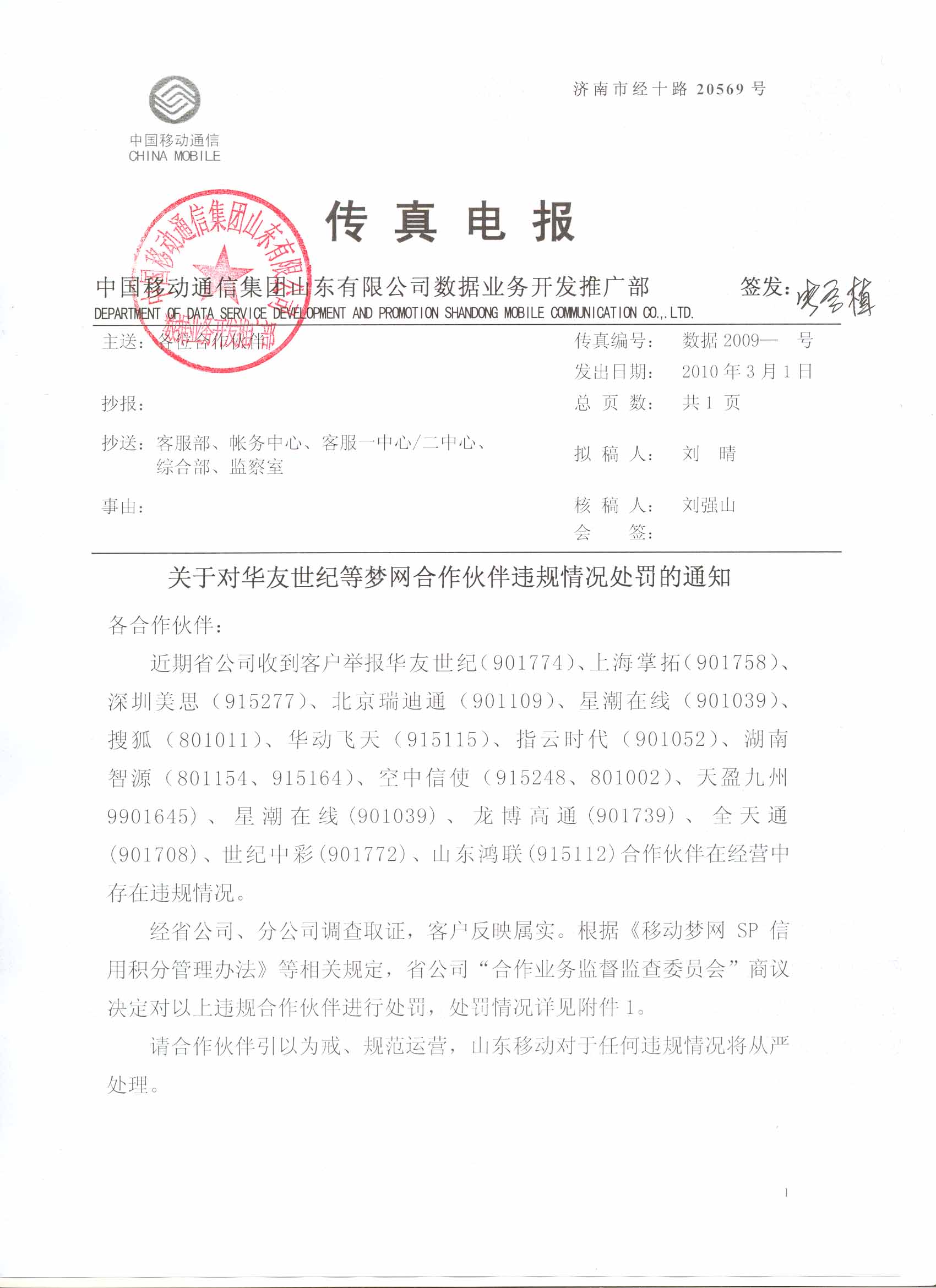 | 12 | 星潮在線 | 901039 | 10665366 | 該公司“生活服務(wù)”業(yè)務(wù),提供代收費服務(wù)。 | 暫停該公司“生活服務(wù)”業(yè)務(wù)(業(yè)務(wù)代碼:XXSHFF )在山東地區(qū)的服務(wù)2個月?鄢庞梅e分20分。 |